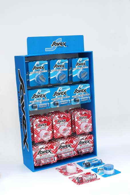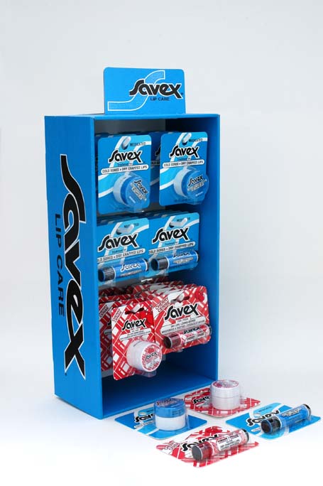 SAVEX 24 DOZEN ASSORTED MEDICATED AND CHERRY LIP BALM JAR & STICK BLISTER PACK FLOOR STAND